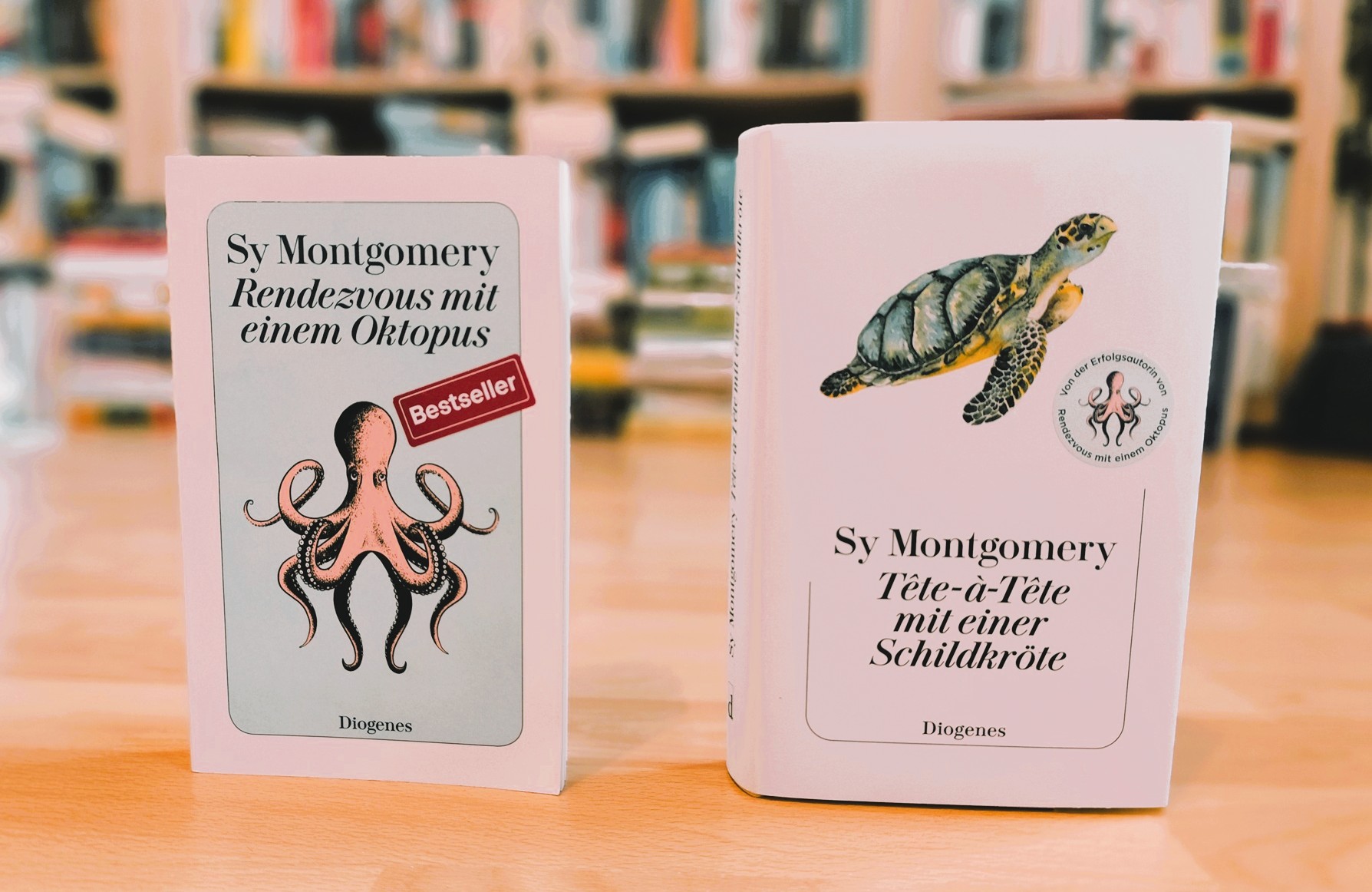 Sy Montgomery: „Rendezvous mit einem Oktopus“ und „Tête-à-Tête mit einer Schildkröte“, erschienen im Diogenes Verlag, in der Übersetzung aus dem Amerikanischen von Heide Sommer beziehungsweise Stefanie Schäfer; 384 Seiten, 15 Euro (Taschenbuch) beziehungsweise 432 Seiten, 26 Euro